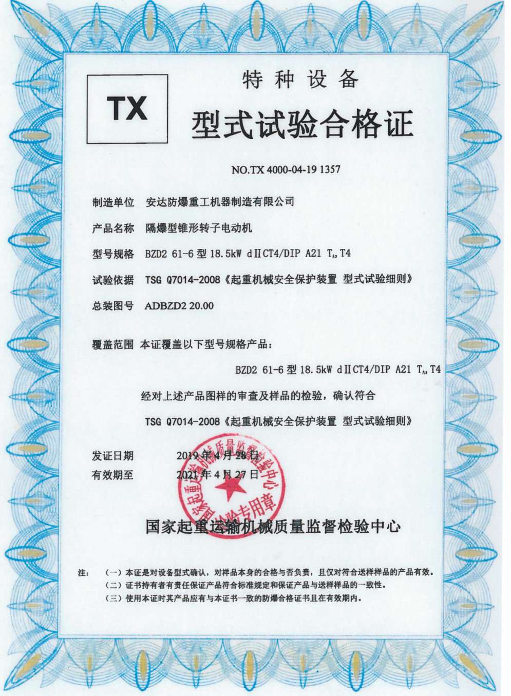 » 隔爆型錐形轉子電動機 TX型式試驗合格證