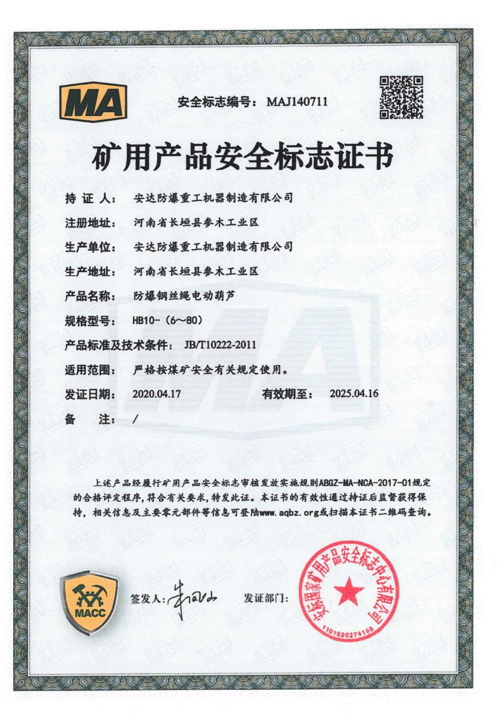 防爆鋼絲繩電動葫蘆 礦用產品安全標志證書