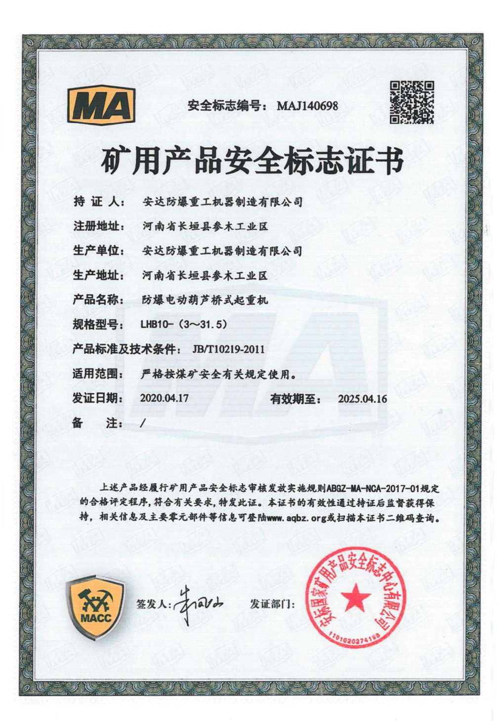發證機構:   安標國家礦用產品安全標志中心有限公司 發證時間 :   2020-04-17
