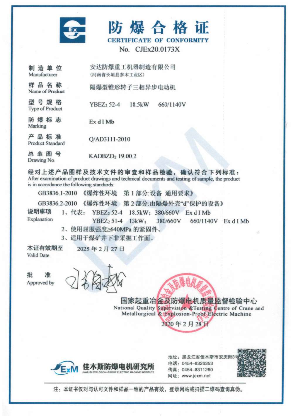 | 發(fā)證機(jī)構(gòu): | 國(guó)家起重冶金及防爆電機(jī)質(zhì)量監(jiān)督檢測(cè)中心 | 發(fā)證時(shí)間 : | 2020-02-28 |