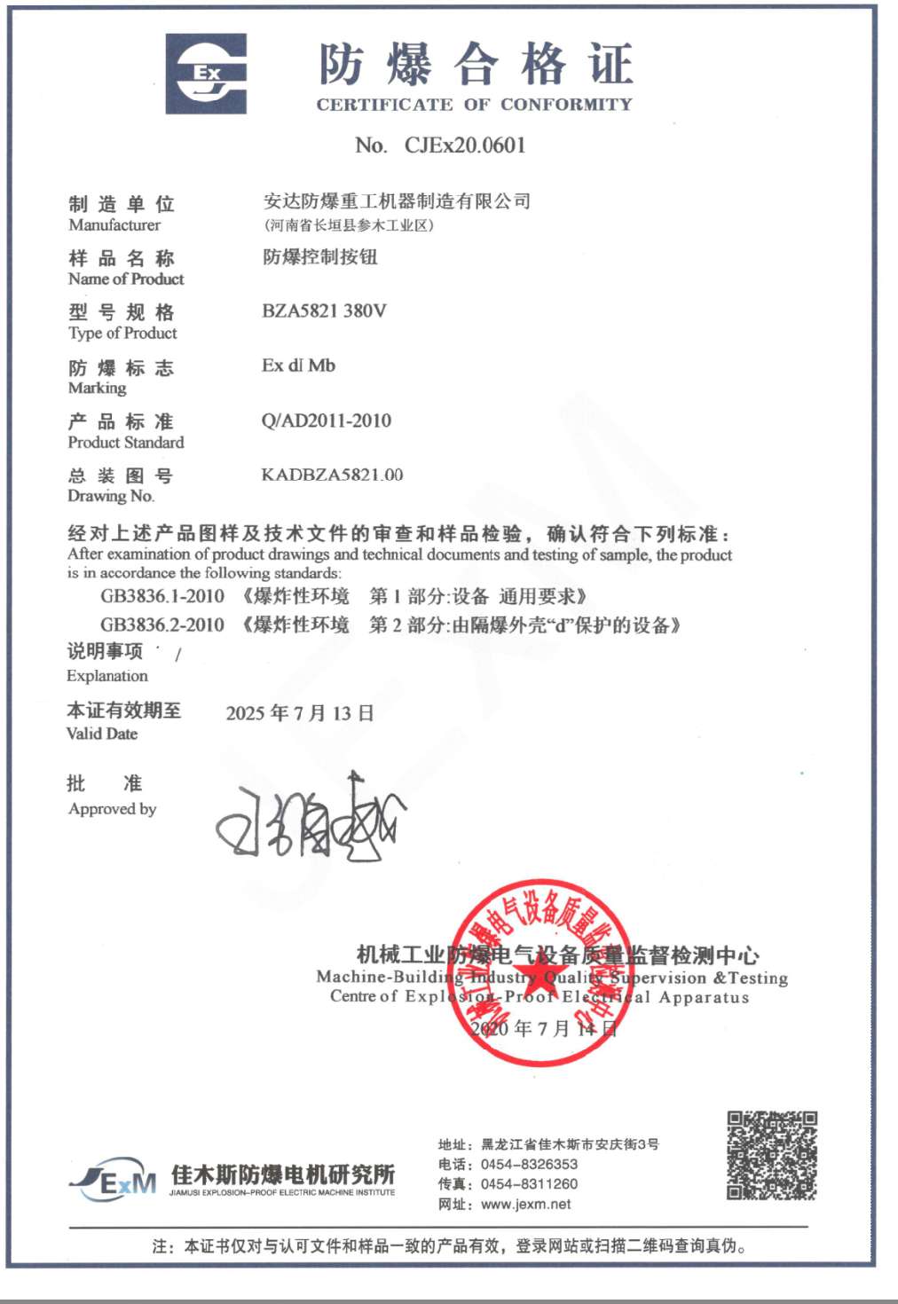 | 發(fā)證機(jī)構(gòu): | 機(jī)械工業(yè)防爆電氣質(zhì)量監(jiān)督檢測(cè)中心 | 發(fā)證時(shí)間 : | 2020-07-14 |