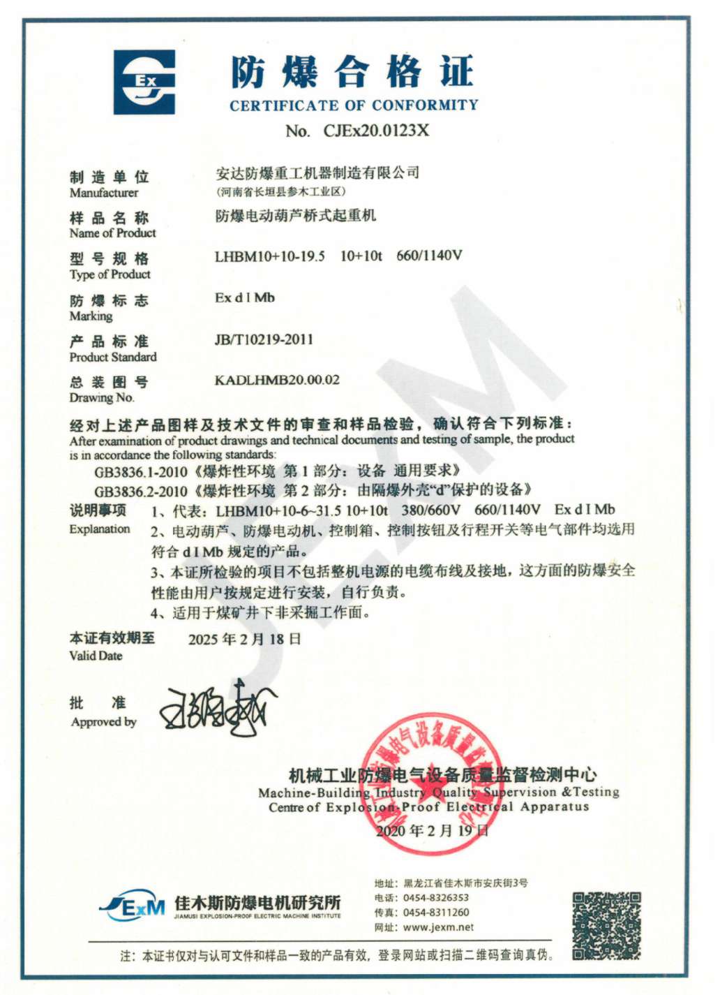 | 發(fā)證機(jī)構(gòu): | 機(jī)械工業(yè)防爆電氣設(shè)備質(zhì)量監(jiān)督檢測(cè)中心 | 發(fā)證時(shí)間 : | 2020-02-19 |