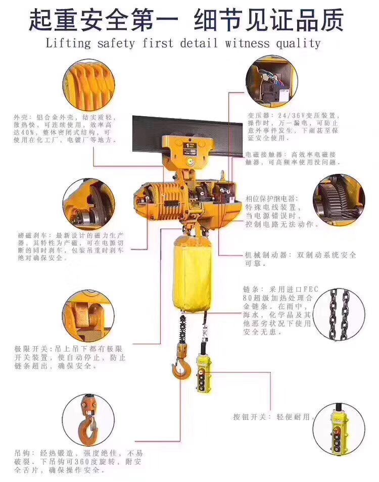 本公司產(chǎn)品品種齊全,質(zhì)量可靠,價格合理,售后服務(wù)周到。還可根據(jù)用戶要求,設(shè)計各種非標電動葫蘆和非標起重機。愿本公司的產(chǎn)品,成為貴單位理想的選擇。