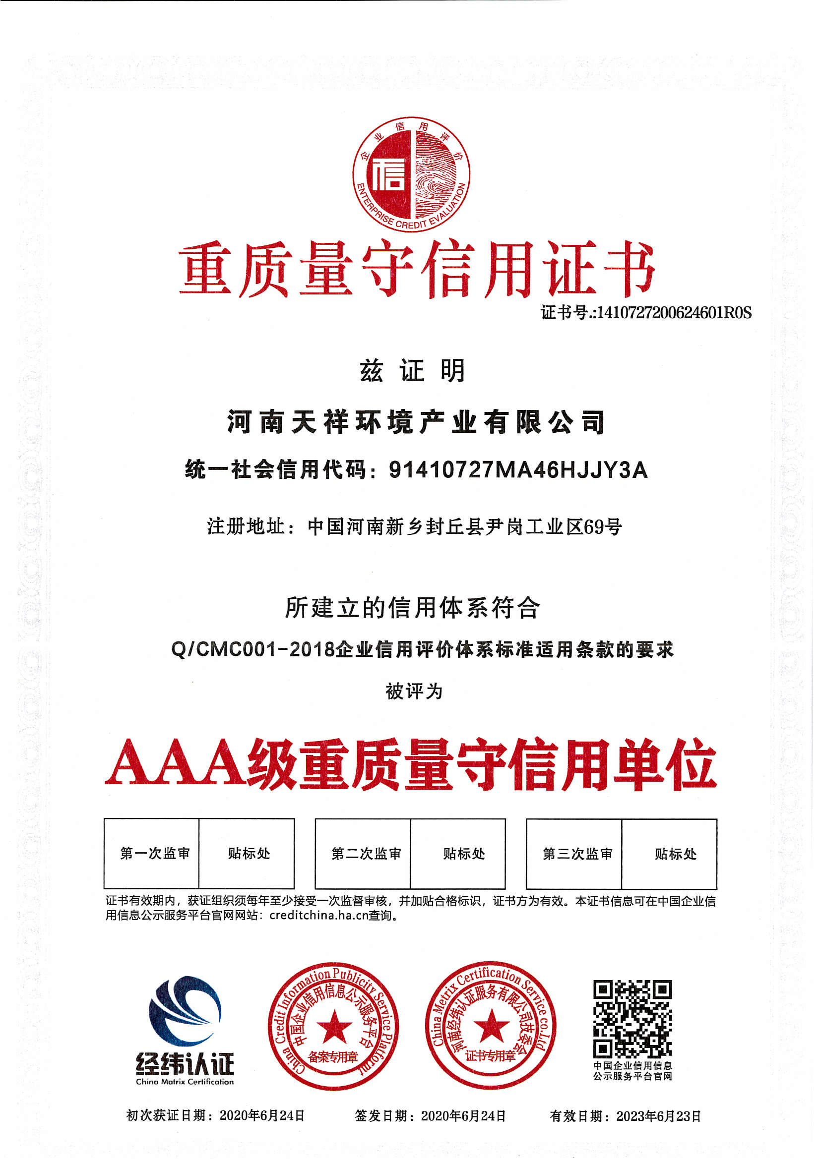 發證機構:   第三方信用評級機構 發證時間 :   2020-06-24