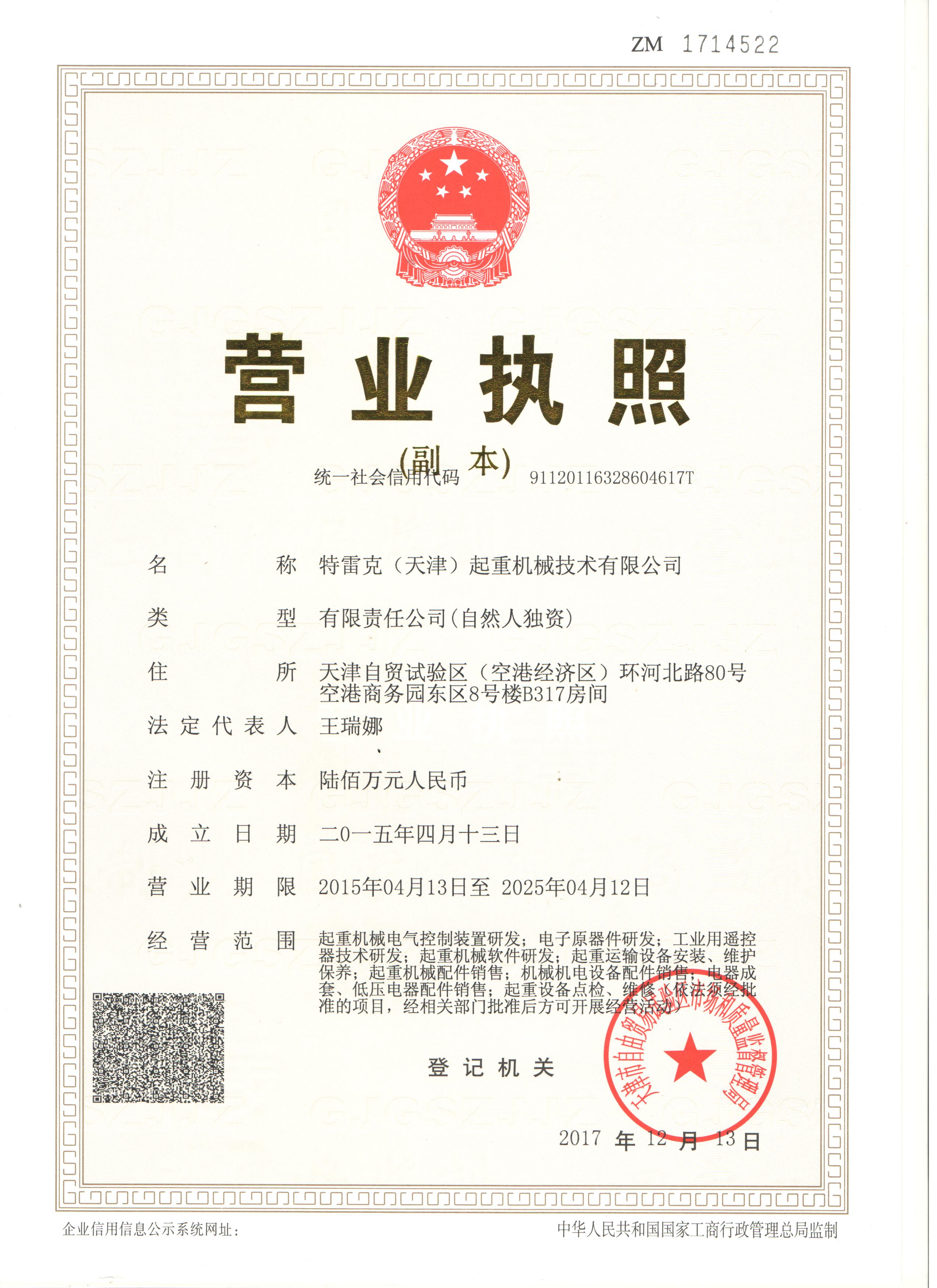 2015年特雷克(天津)起重機械技術有限公司正式成立,主營起重機械電氣控制裝置研發,電子元器件研發,工業用遙控器技術研發,起重機械軟件研發,起重運輸設備安裝,維修和保養,起重機械配件銷售,機械機電設備配件銷售,電器成套,低壓電器配件銷售,起重設備點檢維修等經相關部門批準可開展經營**。