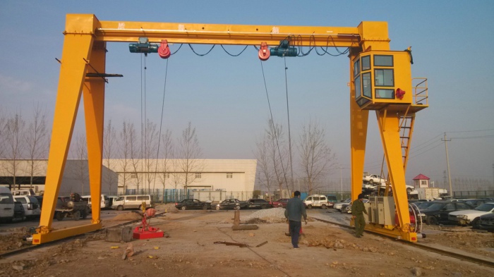 “門式起重機是橋式起重機的一種變形,又叫龍門吊。主要用于室外的貨場、料場貨、散貨的裝卸作業。門式起重機具有場地利用率高、作業范圍大、適應面廣、通用性強等特點,在港口貨場得到廣泛使用。它的金屬結構像門形框架,承載主梁下安裝兩條支腳,可以直接在地面的軌道上行走,主梁兩端可以具有外伸懸臂梁。”