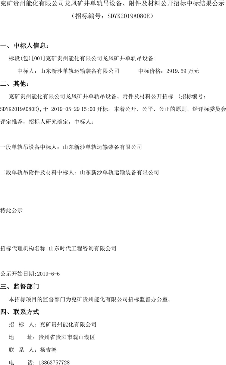 移動版:兗礦貴州能化有限公司龍鳳礦井單軌吊設備、附件及材料公開招標中標結果公示