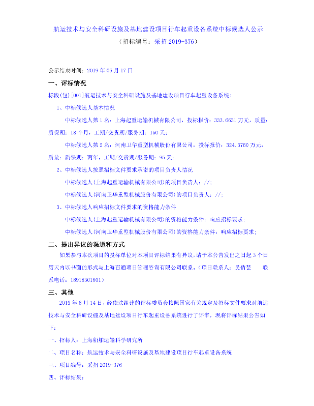 航運技術與安全科研設施及基地建設項目行車起重設備系統中標候選人公示