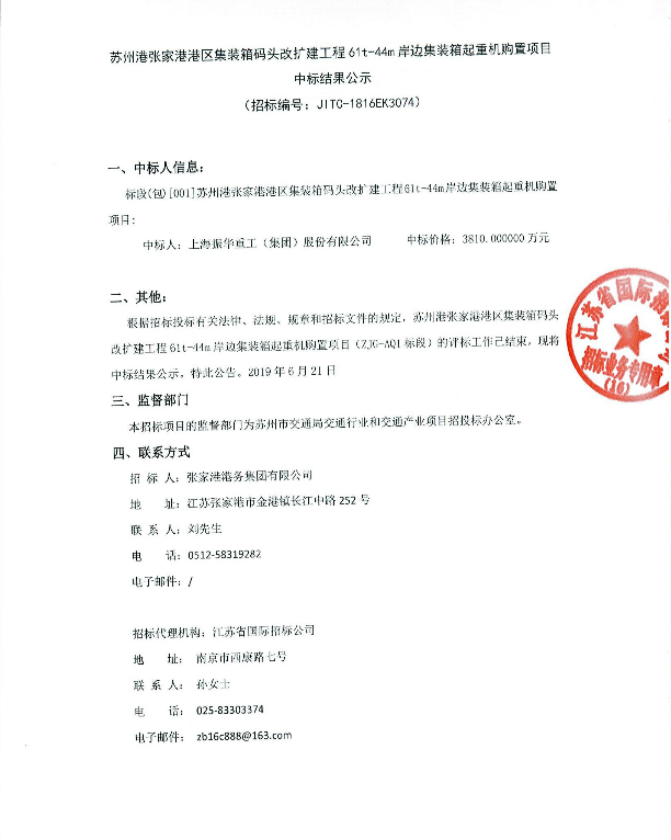 蘇州港張家港港區(qū)集裝箱碼頭改擴建工程61t-44m岸邊集裝箱起重機購置項目中標結(jié)果公示