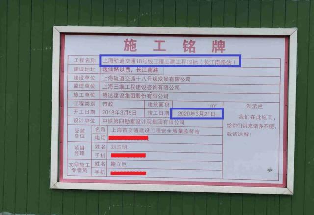 下面是上海軌道交通18號線長江南路站的施工銘牌,這里明確表示了土建工程的完成時間是2020年3月。