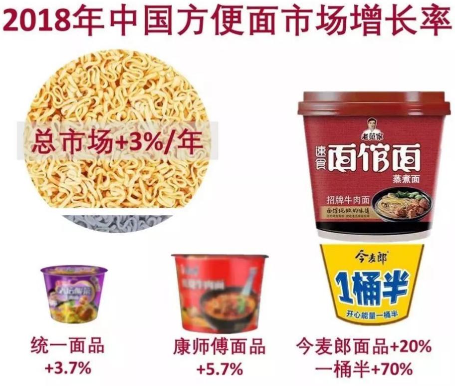 根據里斯咨詢的統計,2017-2018年,今麥郎增速同比增長20%,而同一時期的康師傅增速為5.7%,統一為3.7%。2018年今麥郎方便面業務突破70億,僅僅排在康師傅和統一之后,成為了中國方便面市場前三甲之一。