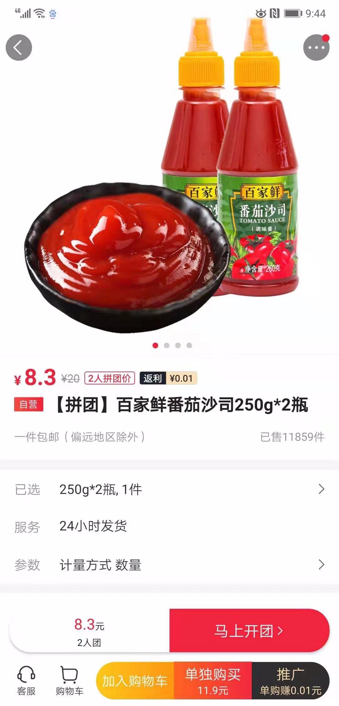同樣在每日一淘平臺(tái)上推出的拼團(tuán)價(jià)為8.3元2瓶的百家鮮番茄沙司,月銷(xiāo)售突破1萬(wàn)筆。