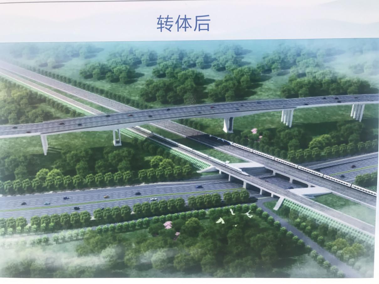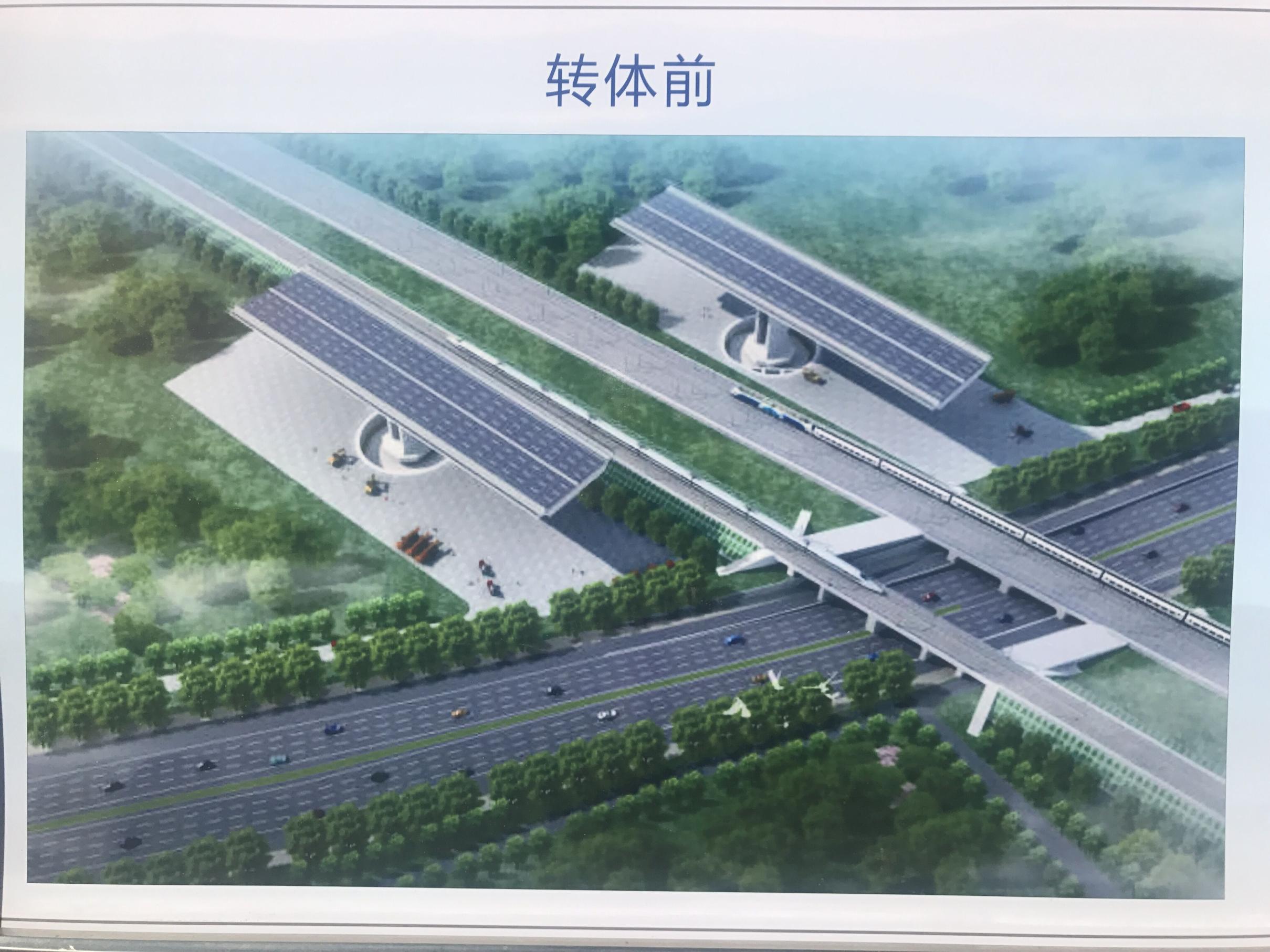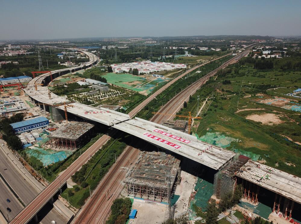 該工程上跨鄭焦城際、京廣鐵路、軍專線等3條線5股道,每天有140對高鐵列車和貨運列車“擦肩而過”, 轉體橋與鐵路線的最近距離只有8.7米。橋梁全長317米,寬38.7米,道路采用雙向8車道,轉體懸臂長71.75米,單側轉體橋梁重達3萬噸,采用85m+147m+85m連續剛構轉體施工。