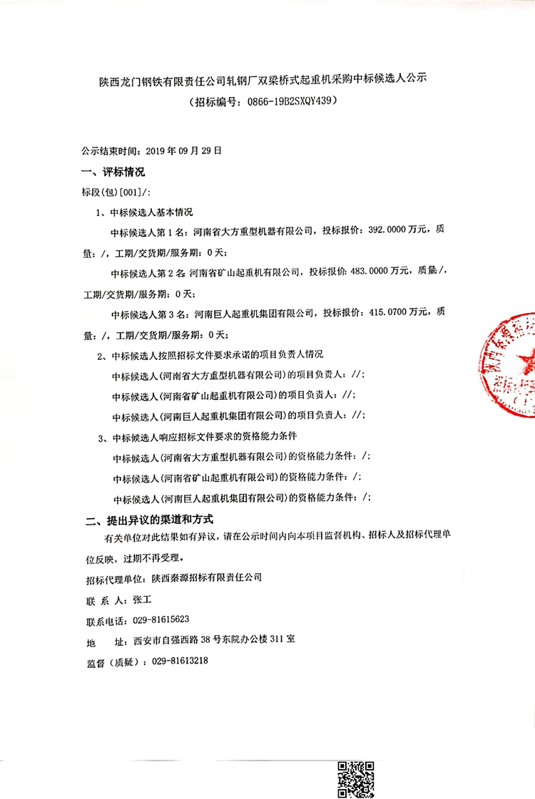 陜西龍門鋼鐵有限責任公司軋鋼廠雙梁橋式起重機采購中標候選人公示