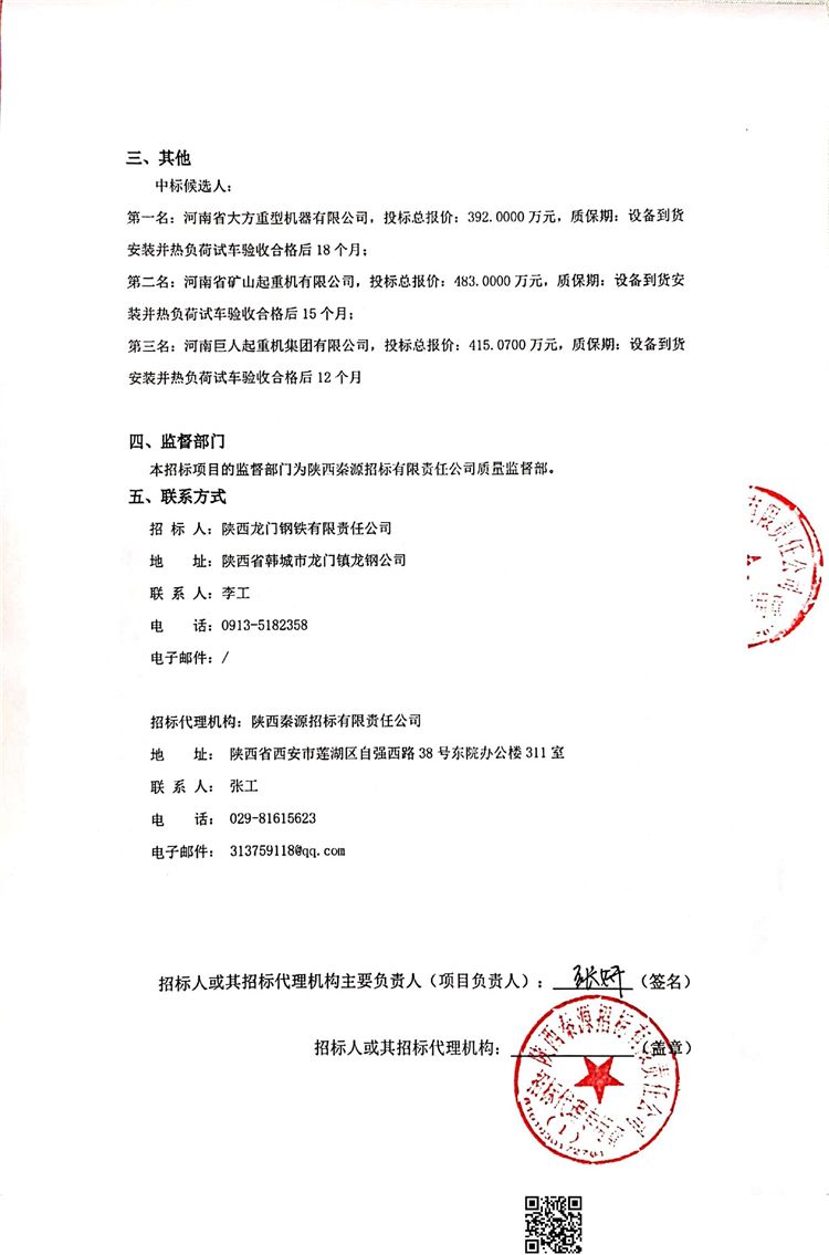移動版:陜西龍門鋼鐵有限責任公司軋鋼廠雙梁橋式起重機采購中標候選人公示