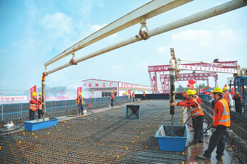 箱梁預(yù)制在位于自貢市沿灘區(qū)的中鐵北京工程局自宜鐵路項目鄧關(guān)制梁場進(jìn)行。箱梁成“U”狀,長32米、寬12.6米、高3.05米,可鋪設(shè)雙線軌道。9時許,隨著一聲令下,2輛混凝土罐車齊齊開動,混凝土噴漿而出,從位于“二樓”的箱梁表面層滲漏進(jìn)模具里;箱梁腰身部位,數(shù)名施工人員和技術(shù)人員忙著進(jìn)行混凝土澆筑維護(hù)作業(yè)。