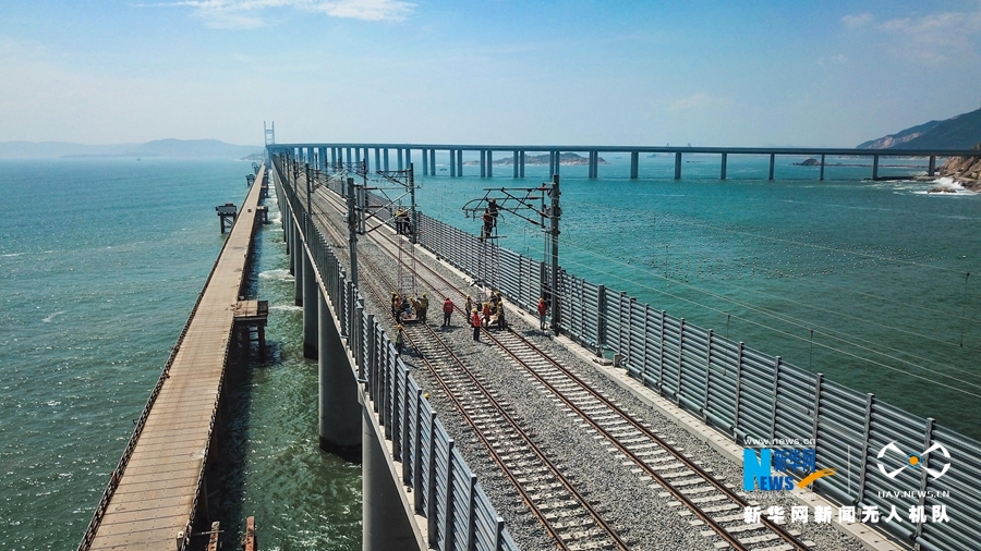 新華網福州9月10日電(張婷婷 袁羽)在六米高的高空作業是一種怎樣的體驗?如果這個高空還是在海上呢?近日,在即將通車的平潭海峽公鐵兩用大橋上,十幾名接觸網工頭戴安全帽,腰系保險帶,時站、時俯、時仰、時蹲……在離橋面六米的高空對鐵路接觸網設備進行全面體檢。