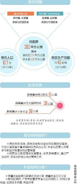 根據(jù)方案,新區(qū)規(guī)劃范圍包括重慶市渝北區(qū)茨竹鎮(zhèn)、大灣鎮(zhèn)的部分行政區(qū)域和四川省廣安市鄰水縣高灘鎮(zhèn)、壇同鎮(zhèn)的部分行政區(qū)域,總面積262平方公里,其中渝北區(qū)124平方公里、鄰水縣138平方公里,2019年常住人口10.7萬、實現(xiàn)地區(qū)生產(chǎn)總值約45億元。