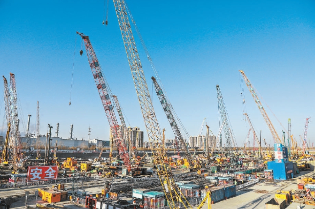 城市副中心站綜合交通樞紐施工現場塔吊林立、機器轟鳴,一派熱火朝天的建設景象。