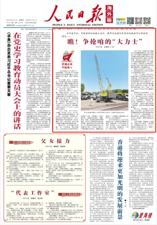 4月1日,《人民日?qǐng)?bào)》(海外版)頭版發(fā)表了《瞧!爭(zhēng)搶咱的“大力士”(開局之年干起來)》文章。人民日?qǐng)?bào)記者以走進(jìn)中聯(lián)重科麓谷工業(yè)園的一線見聞,呈現(xiàn)了公司生產(chǎn)、銷售的繁忙圖景;講述了履帶起重機(jī)高端市場(chǎng)從最初被歐美品牌占據(jù),到如今以中聯(lián)重科為代表的中國制造“大力士”熱銷海內(nèi)外。文章聚焦中聯(lián)重科,向海內(nèi)外讀者生動(dòng)地展現(xiàn)了中國裝備制造的技術(shù)實(shí)力以及市場(chǎng)活力,也展示了“十四五”開局之年中國裝備制造企業(yè)的新氣象、新風(fēng)貌。