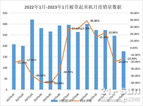 據(jù)我國工程機(jī)械工業(yè)協(xié)會對8家履帶起重機(jī)制作企業(yè)計算,2023年1月月當(dāng)月出售各類履帶起重機(jī)175臺,同比下降15.5%。