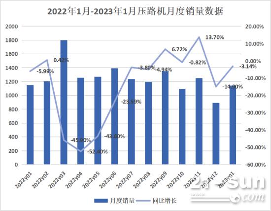 據(jù)中國工程機(jī)械工業(yè)協(xié)會對19家壓路機(jī)制造企業(yè)統(tǒng)計,2023年1月當(dāng)月銷售各類壓路機(jī)1142臺,同比下降3.14%。