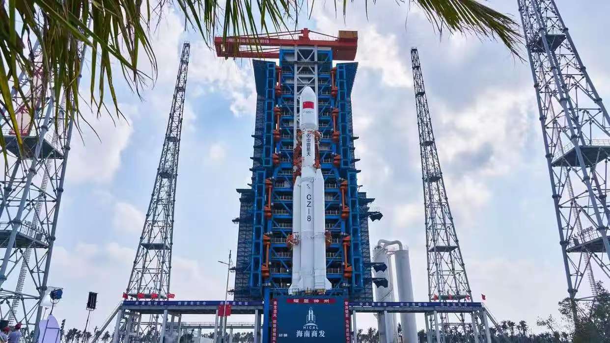 在發射區,1號發射工位固定勤務塔上大方火箭發射專用起重機對長征八號甲火箭進行吊裝,高精度配合其順利完成了分系統測試、總檢查測試、搶險演練及模擬加注發射等一系列流程。