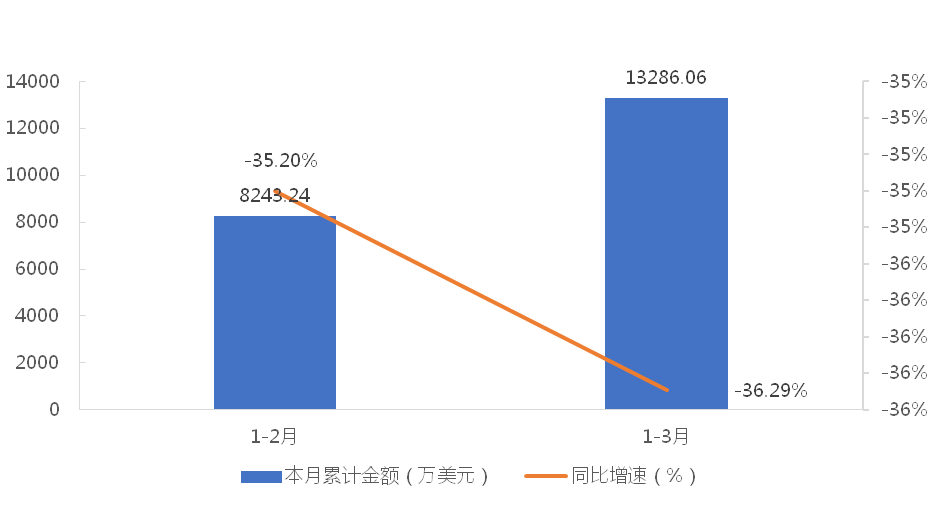 1-3月,我國(guó)龍門式起重機(jī)累計(jì)出口金額為13286.06萬美元,同比下降36.29%;累計(jì)出口數(shù)量為974臺(tái),同比增長(zhǎng)12.60%;出口均價(jià)為13.64萬美元/臺(tái),同比下降43.43%。