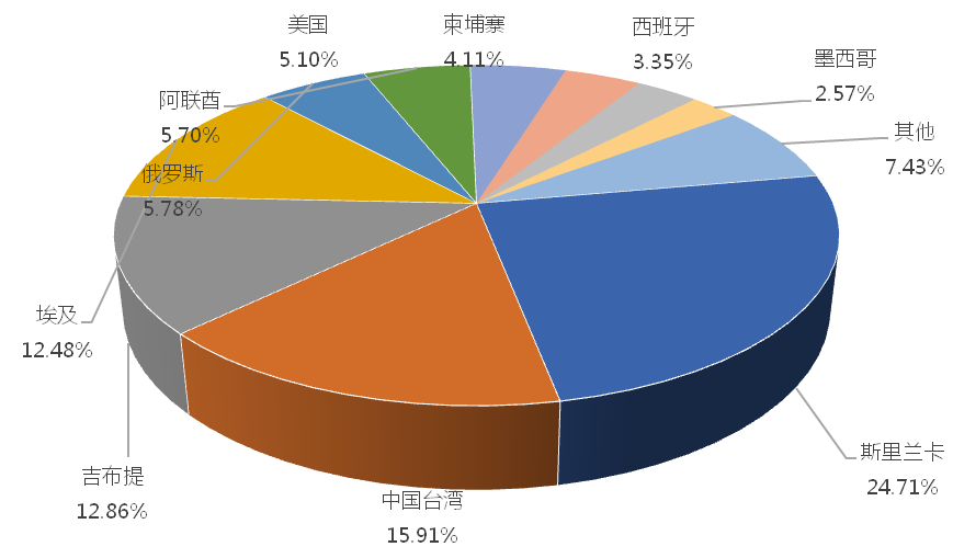 1-3月,我國(guó)龍門式起重機(jī)出口金額排名前十的國(guó)家/地區(qū)分別為斯里蘭卡、中國(guó)臺(tái)灣、吉布提、埃及、俄羅斯、阿聯(lián)酋、美國(guó)、柬埔寨、西班牙、墨西哥,合計(jì)占我國(guó)該產(chǎn)品出口總額的92.57%。其中,向斯里蘭卡出口最多,金額為3282.84萬美元,占出口總額的24.71%。